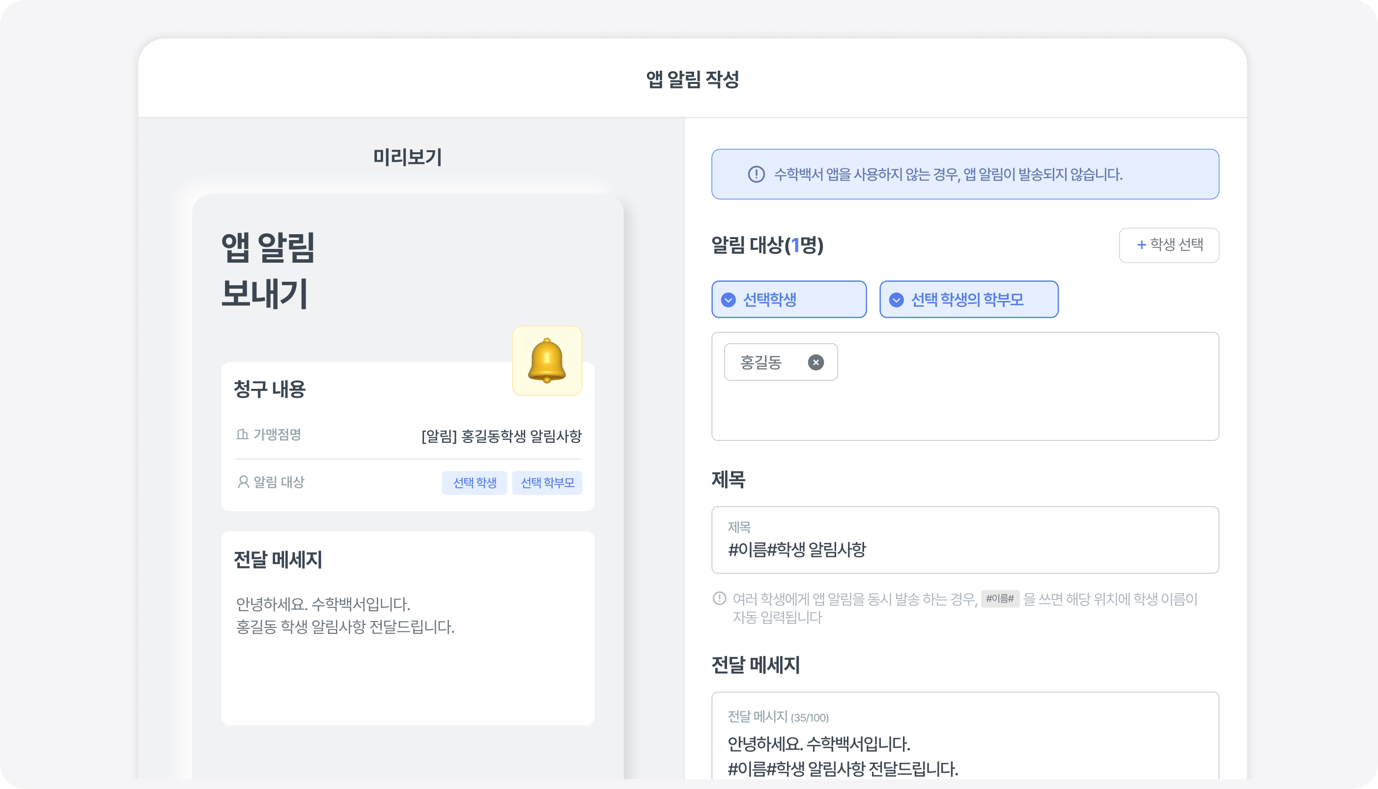 학생과 학부모 내가 원하는 대상만 따로 발송할 수도 있어요