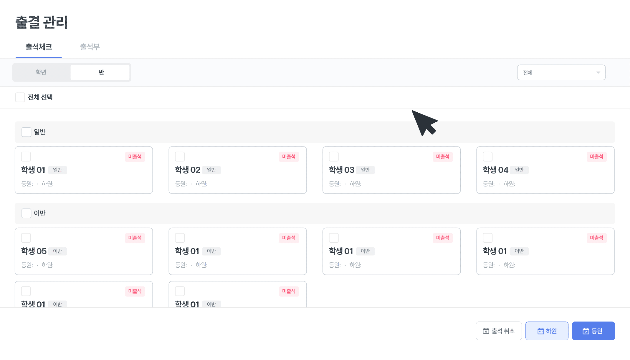 학년별/반별 내가 관리하는 모든 학생들을 클릭 한 번에 출석 체크할 수 있어요