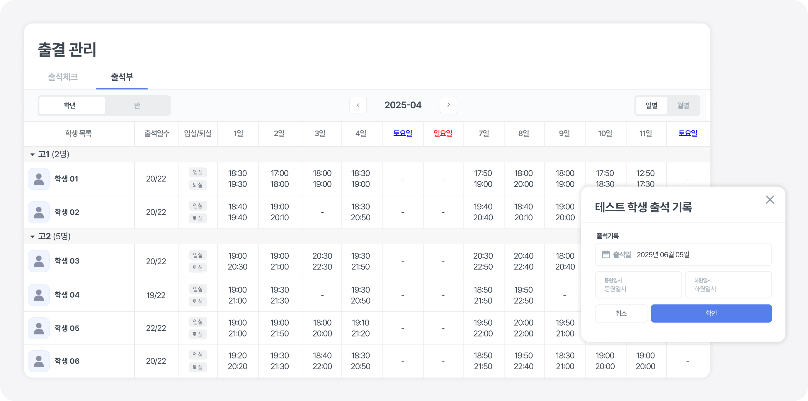 많은 학생도 학년별/반별로 한눈에 보고 관리할 수 있어요