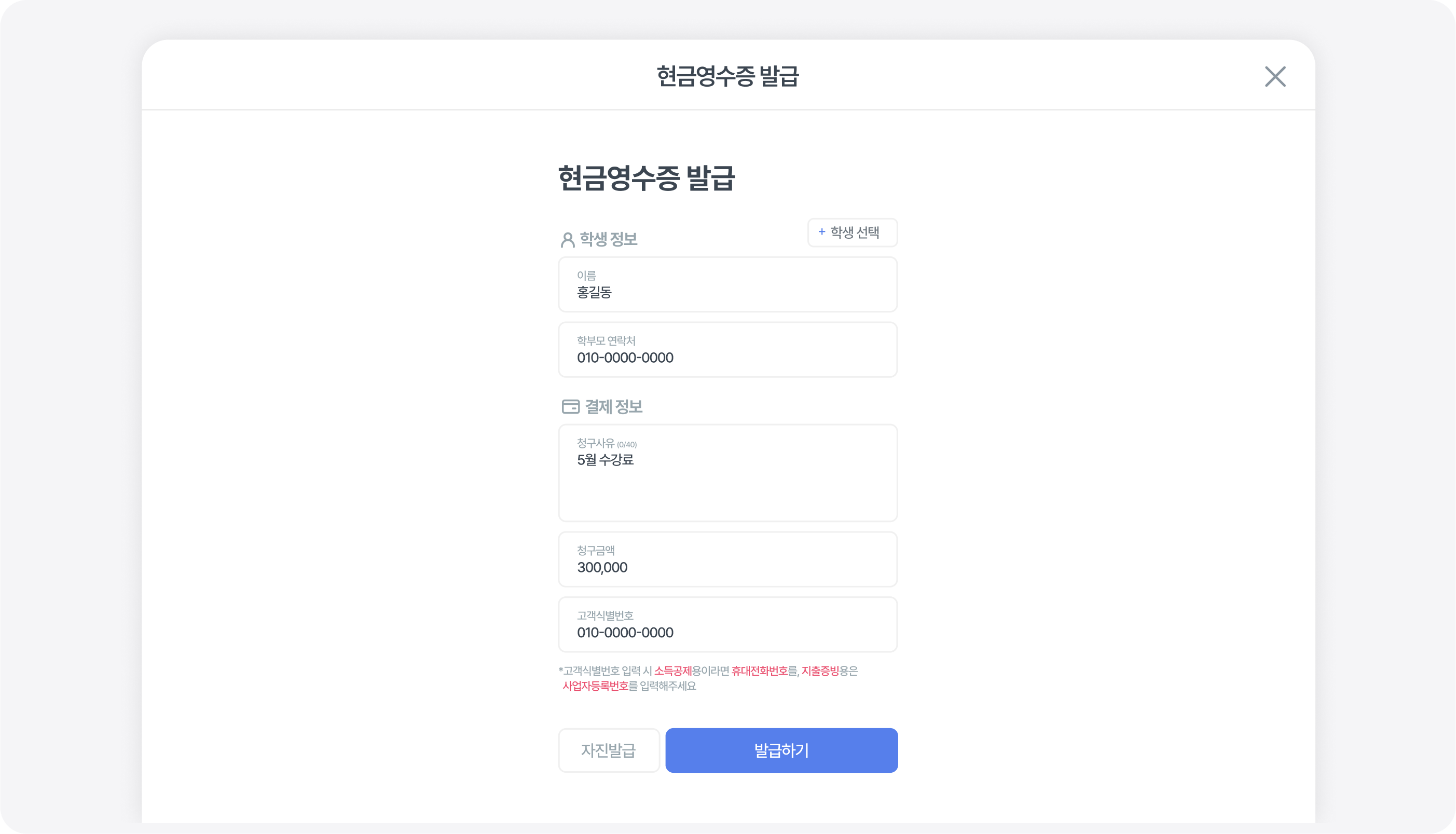 * 발행된 현금영수증은 자동으로 매출 집계됩니다